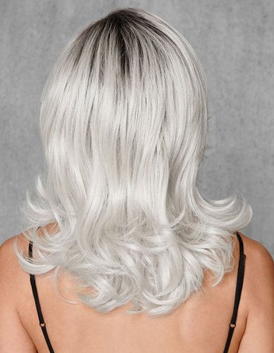 The classic slightly longer than mid length hairstyle is a fabulous shade of silvery white with darker roots.